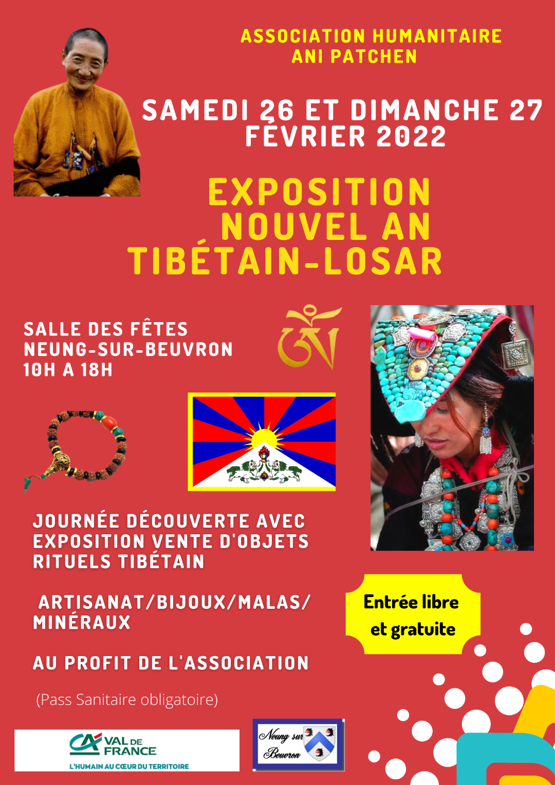 tashi délek après cette douloureuse épreuve nous reprenons nos activités à savoir (marché..arbre de noêl ect) et nous sommes heureux de vous annoncer nôtre exposition du nouvel an tibétain (losar) les 26et27 février 2022 dans la salle des fêtes de neung sur beuvron 41210 voir l'affiche, pour tout renseignements ..lama dordje jean claude domange 0667848217 au plaisir de vous retrouver