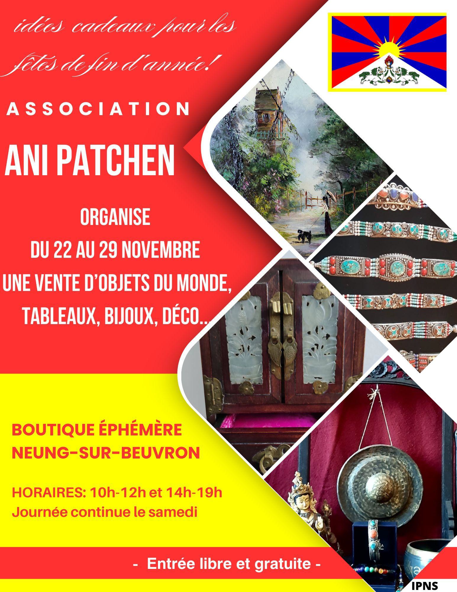 Du 22 au 29 novembre prochain, l'association ANI PATCHEN vous attend à la boutique éphémère de NEUNG-SUR-BEUVRON (41210). Vente d'objets du monde, tableaux, bijoux, déco...