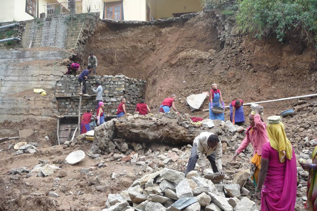 reconstruction par les nonnes tibétaines et les femmes indiennes après un effondrement à mac léod gang ( dharamsala) en 2010... avec le sourire et en chantant